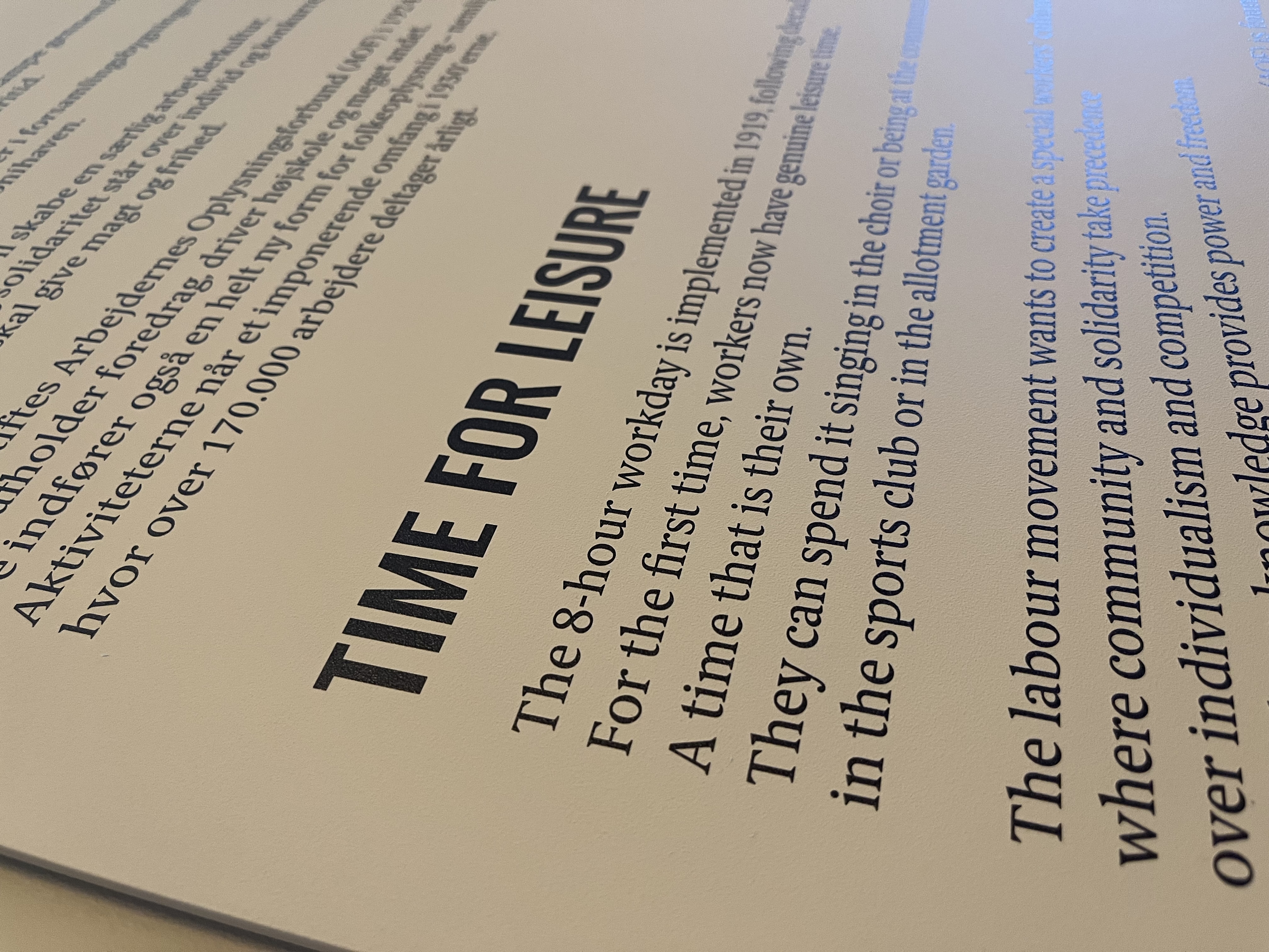 Research, tests, print methods, pitches, documentation and final outcome of a permanent exhibition at Arbejdermuseet in Copenhagen. Expo about the workers from 1871-1939. The headlines, captions on assets, flags, rollups, colours and so on.
